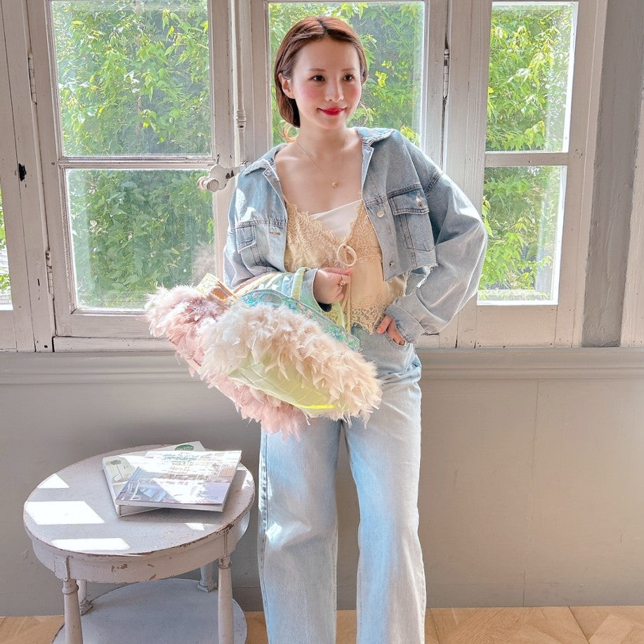 特にフェザーに関しましては天然素材のため、色ムラ、長さ、ボリュームに個体差が生じることがございます。