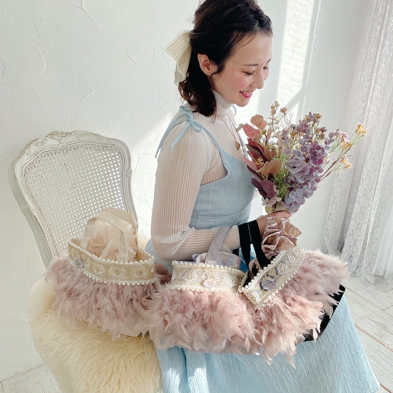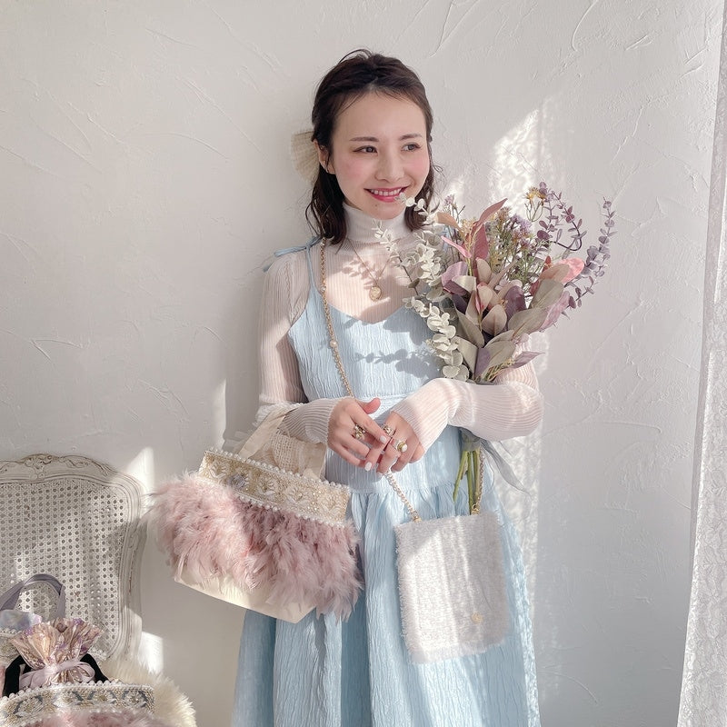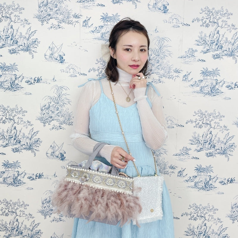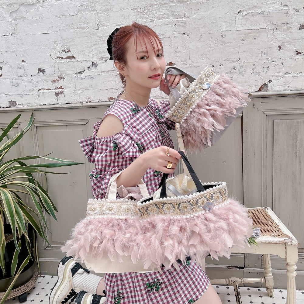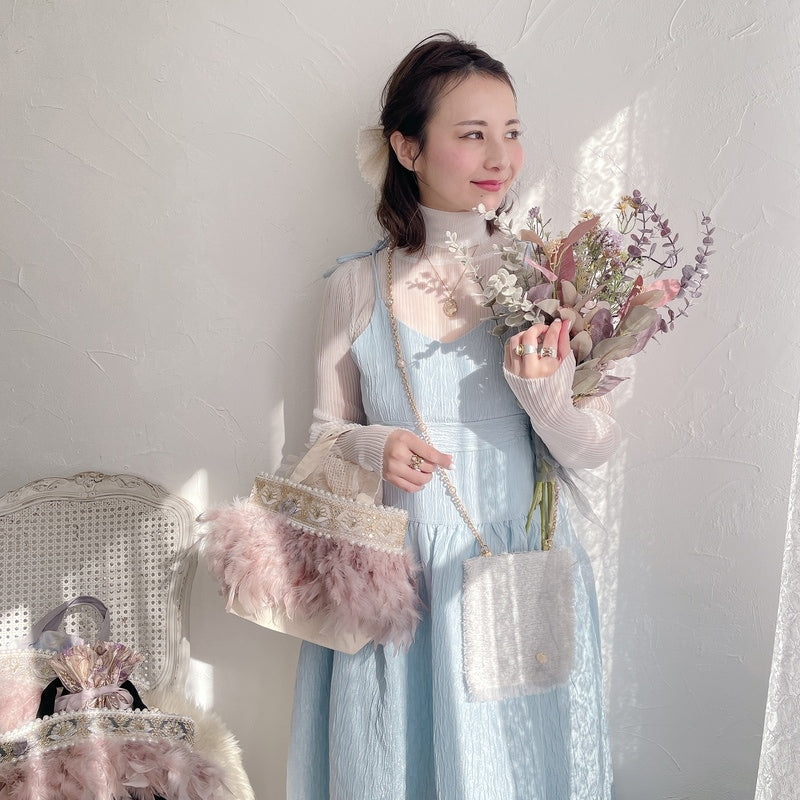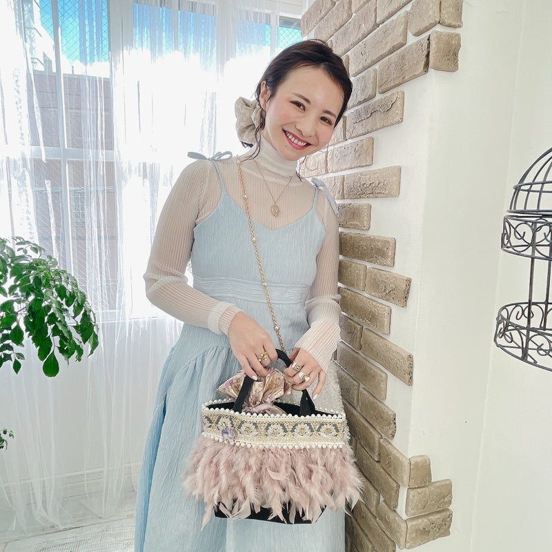 ■商品画像は、照明の関係により、実際よりもやや明るく見える場合がございます。 ****************************************** BAG ■【Fluffyシリーズ】インポートのテープを使用し、手作業でお作りしております。そのため商品画像との色ムラ、大きさ、装飾、縫製などの個体差が生じることがありますが、欠陥品ではございません。 ■【Fluffyシリーズ】発送時の梱包により、開封時はフェザーのボリュームが少なく感じますが、空気を含むとボリュームが復活します。 また、フェザー部分は大変繊細なので、使用しているうちに抜け落ちることがございますが、材質特性上でありますことをご理解くださいませ。 ■テープ、フェザー、ビジュー等の装飾品は大変繊細ですので、お取り扱いには十分ご注意ください。 ■水に濡れたり、日光にあたった場合色落ちする事がございます。 ■【カゴバッグ】天然素材を使用しておりますので、色合いやサイズ、仕上がりの風合いが1点1点異なります。 ****************************************** Apparel【海外製品の特性(品質)について】 一部のインポート製品は日本の製品と比べ品質基準が甘く、下記のような商品も含まれます ●着用に問題のない縫製の歪み、あまさ ●柄生地の柄の場所や出方、生地のつなぎが異なる ●裏地(表から見えない部分)の小さな傷、ツレ ●裏地(表から見えない部分)のシミや汚れ ●梱包材や染料のにおい これらの製品も、販売するにあたり差し障りのないものと判断されており、良品(通常の商品)として流通、販売されております。 当店でも商品1点ずつ検品し、海外の品質基準を満たしているもの、ご着用に問題がないことを確認の上、販売しておりますご了承の上、ご検討くださいませ